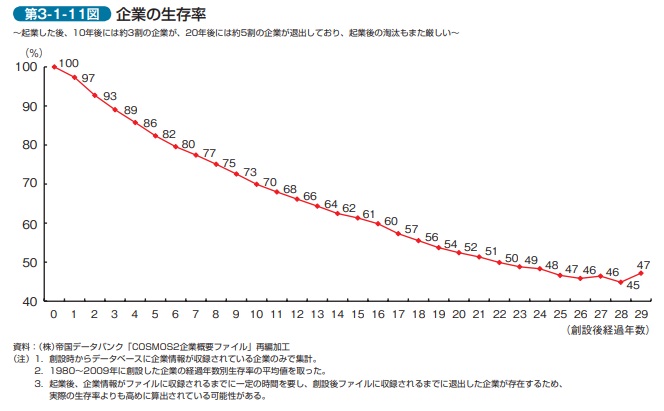 つまり、大学を卒業した方が、創業ベンチャーに入ったら、30年以内に半数が倒産する。